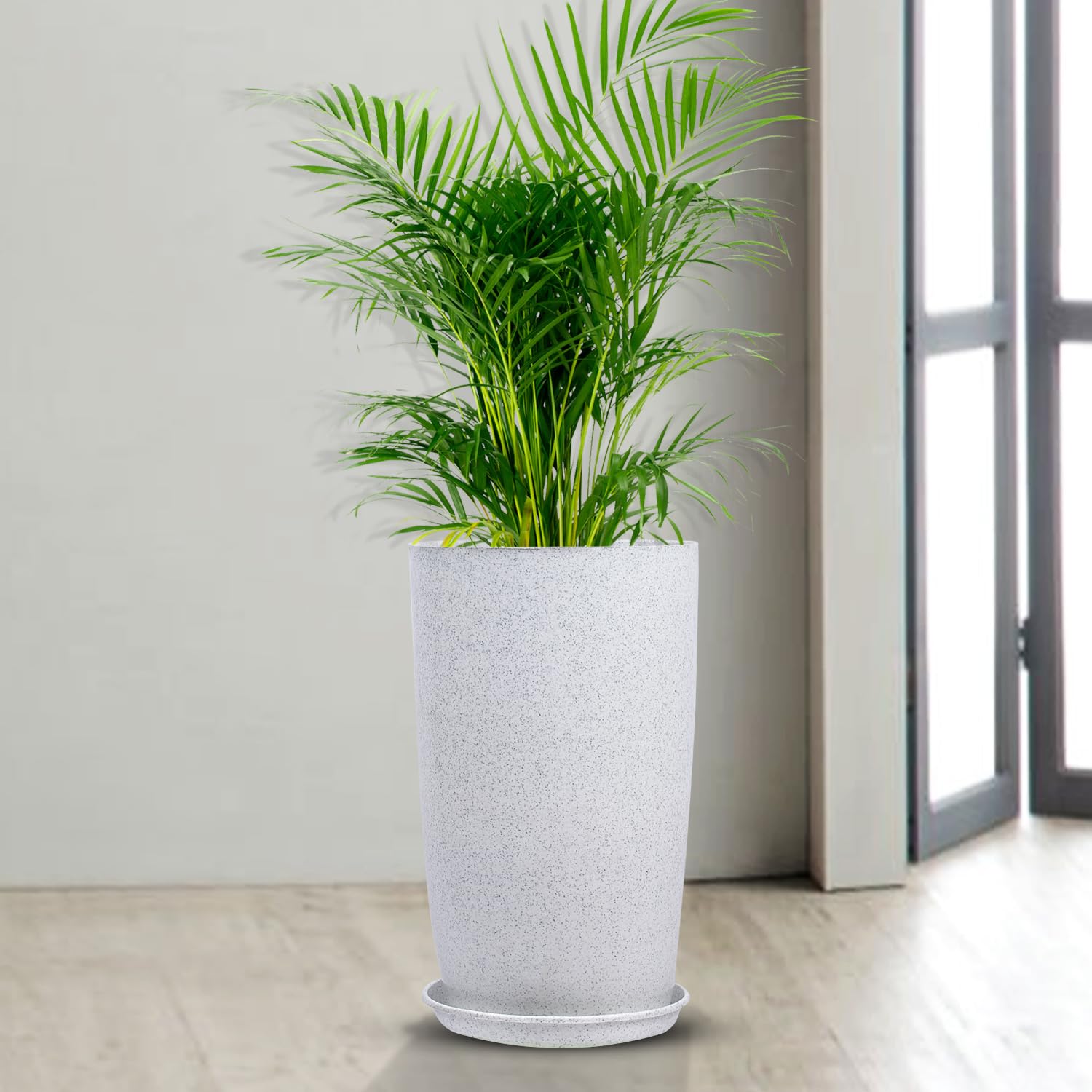 Enhance your indoor or outdoor garden with the Kindred Botanics Ceramic Plant Container. Measuring 27 cm x 27 cm x 44 cm (18 inches), this planter features a sleek, round design in marble emerald finish that adds a sophisticated touch to windows, balconies, or lawns. Made from durable German polymer, it offers weather resistance and long-lasting performance while remaining lightweight. The included base plate ensures effective water drainage, making maintenance simple and supporting healthy plant growth. Perfect for creating a vibrant, flourishing space with minimal effort.